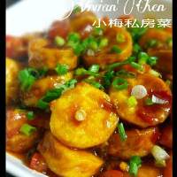 锅里的汁烧开以后把日本豆腐倒进去小心的裹上汁,这一步注意技巧容易翻烂的