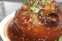 烧开后,放入适量味精、淀粉水,勾芡完毕后加入葱末,调匀后将鱼香汁淋于盘中的肘子上,撒上白芝麻和香菜作为装饰。