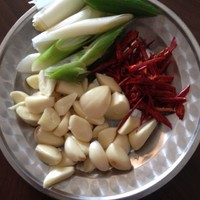姜切片、蒜剥好后整粒备用。 葱切段、干辣椒剪段备用。