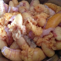 锅中入底油,约6成热时下入葱姜蒜一大勺老干妈爆香; 将鱼籽铺在葱姜蒜上,加入酱油、料酒; 加高汤至与鱼籽齐平,加干辣椒、盐、糖后盖盖大火烧开;