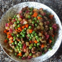 热锅凉油,放牛肉丁翻炒,肉丁变色后放葱姜,生抽豌豆土豆萝卜等继续翻炒,锅底要干的时候加一碗水,蚝油焖煮。待锅中水快干的时候加盐,黑胡椒粉翻炒出锅。