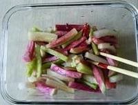 密封放冰箱冷藏24小时以上更好吃,中间要翻动一到两次腌制更均匀。下图中是另外一次专门腌的萝卜皮,特别爽口
