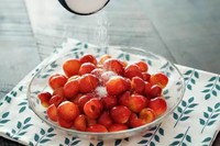 400g樱桃洗净去核,倒入45g白砂糖抓匀覆上保鲜膜腌制1-2小时。