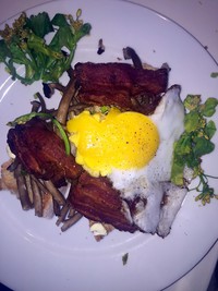 ?主体 3.拿出鸡蛋或鸭蛋、煎至喜欢的程度。 4.开始煎蛋前把蘑菇放进预热好的220度的烤箱、6分钟后拿出。 5.开始煎蛋前将切片面包放进面包机烤30秒。 6.面包煎好后、一次将面包、蘑菇和最后煎好的蛋由底向上马放、周围配上金银花点缀。蛋面撒上盐和胡椒。