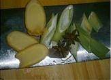 看到肉有点微微变黄,再放入葱、姜、八角、桂皮炒,炒出香味后倒入少许料酒、生抽及老抽,炒匀后加浸泡榛蘑的水至没过五花肉