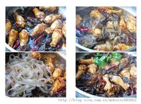 翻炒后加水,放红薯粉条,炖至鸡肉软烂、汤汁浓稠,加少许味精,香菜出锅即可