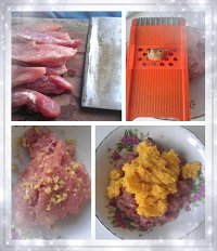 用瘦肉剁肉糜。 剁好后加入姜末姜汁,酒,盐(依据个人口味) 加入红薯泥(粗粮既健康,又可以使肉糜松软滑腻) 红薯泥做法(切块放在水里煮好后撩出用调羹按成泥状) 加入拌肉用的鸡汤,一边拌,一边加汤汁,否则汤汁加多了,肉糜就太湿了。 拌匀。