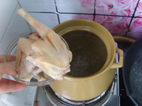 瓦锅内加适量的清水,然后放入焯烫过的鸡肉