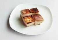 将猪五花肉入沸水中,加葱、姜、大料、料酒、盐煮至七成熟捞出