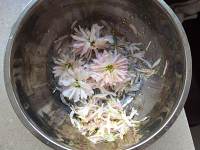 新鲜菊花去花蕊(菊花心大寒,不嫌麻烦可以去掉),花蒂影响形象,可去可不去,去的话花朵容易散开。