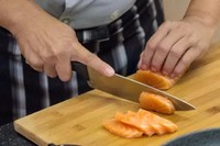 【9】切生鱼片 将三文鱼和多宝鱼都切成片。