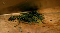 将青柠叶卷起,用刀子将卷起的青柠叶横着剖开后,再切成细条状,放入金枪鱼肉的碗中
