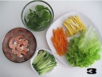 取出泡好的米纸皮,将薄荷叶、虾仁、黄瓜丝、鸡蛋丝、胡萝卜丝、生菜放入其中