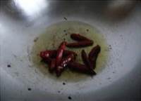 入麻椒粒炸香,捞出不用,下干辣椒炸变色,一同倒在蒜末上