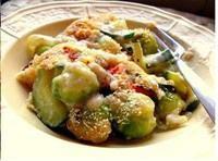 球状甘蓝盐水里煮2分钟捞起沥干 甜椒切丝 西葫芦切片 放在烤盘里拌上少许盐和橄榄油 熬白酱浇在蔬菜上