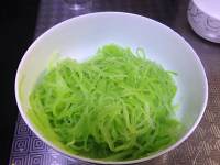 莴笋洗净去皮,切成2mm左右见方的丝,蒜切末,红辣椒切成小段,莴笋用开水焯一下