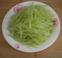 瘦肉切成丝,加入少许淀粉抓匀;大蒜切粒,生姜切丝,葱切花