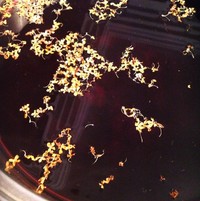 熬製好的酸梅湯,加入乾桂花,當然也可以加入糖桂花。加入糖桂花風味更加。