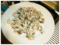 先用中火油炸蘑菇至金黄色捞出,放吸油纸上,蘑菇要一条一条的下锅,不然易粘连