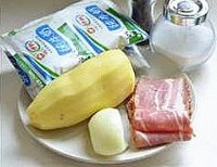 Tip:1.用搅拌机打好的土豆糊十分粘稠,再次加热时一定要不停地搅拌。 2.盐和胡椒粉的用量依自已口味调整吧,欧芹没有就不用加。 3.培根用小火煎至焦黄,吃起来很香的。