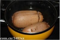 装入大汤锅内,加入没过莲藕的清水,大火烧开,再煮4.5分钟