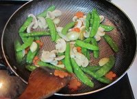 水开后将洗净的荷兰豆和蘑菇片下入锅中