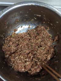 猪肉馅加葱姜沫,油盐等调料顺一个方向搅拌。