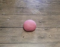 面团取出一个20克和10克的小剂子,20克剂子加入一点搅拌过滤好的红火龙果汁揉成粉红色的面团做装饰用,10克加适量点的可可粉揉成巧克力色面团做眼睛用