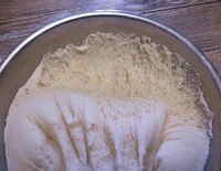 ★提醒一下哈,注意下面这一步骤至关重要,筷子搅拌法和倒酵母水的方法与三光非常的有联系 将碗里的酵母水分次倒入面粉盆中,用筷子一个方向的搅拌面粉,使面粉和水均匀的融合,水千万不要一下全倒完,如果盆底还有一些干面粉,可以适当加些水,(水的多少将影响下面和面过程中三光的难度问题,宁可一点点加,也不可一下全加完,那样很容易让面团变稀黏,难掌控不说,而且会让其他材料比例失调,切记切记这点) 面粉最后成絮状即可。絮状表示面粉和水已经大致融合了,等待你进一步的操作,也就是揉面要开始了