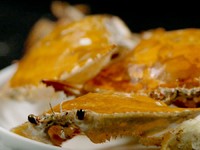 梭子蟹出锅,按照原有的形态摆放,盖上蟹壳,淋上咖喱汁,就完成了。