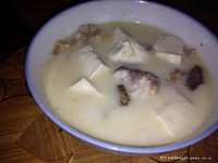 这时候,就可以将鱼汤换锅了。将鱼汤倒入另一个小锅内,放入切好的豆腐,盖上盖子,中小火煲上15—20分钟。之后,根据个人口味,加入少许盐,美味的鱼汤就起锅了!