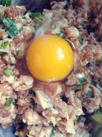 肉沫放入料酒、酱油、胡椒粉、葱姜搅拌均匀再加入鸡蛋拌匀。
