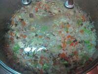 倒入泡香菇的水,再倒入米饭拌开,炒匀,加酱油