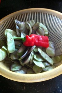 扁豆摘去老梗用清水泡十五分钟洗净沥干、辣椒洗净