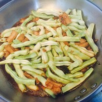肉片断生后加入料酒,再加入酱油一起翻炒,加入适量的盐,再煸炒几分钟后加入开水,水位是锅里扁豆的三分之二处,就是说不没过扁豆。
