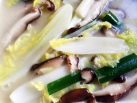 高汤下娃娃菜煮开,放入香菇继续煮,出锅前放入葱段。