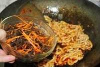 翻炒片刻后倒入之前炒好的红萝卜和黑木耳丝
