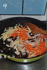 倒入冬笋丝、胡萝卜丝和黑木耳丝转大火翻炒一会儿,再倒入肉丝