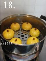 Tip:1.蒸南瓜的时候将南瓜直接放在蒸架上不用放在盘子里,这样可减少南瓜中的水分含量;最好是用微波炉,这样水分会少一些;南瓜面团中面粉的具体用量最终要根据南瓜泥中的水分含量来决定;可根据实情况酌量加减;由于南瓜面团粘性较大,建议面团要和得稍稍硬一些; 2.面团的发酵时间会因温度的不同而有所差异.判断面团是否发酵好的方法为:用手指沾上面粉插入面团中,手指抽出后指印周围的面团不反弹不下陷,说明发酵得刚好.如指印周围的面团迅速反弹,说明发酵的时间还不够;如果指印周围的面团迅速下陷,那么面团则发酵过度了;一般来说,当面团发酵至未发酵前体积的两倍大而面团里面出现许多蜂窝状的小孔时即可; 3.步骤8揉面要充分(我一般揉10分钟左右),要将发酵面团中的空气排出,这样蒸出来的包子表面才光滑; 4.步骤10切好的小剂子最好也用一块湿润的纱布盖起来,以免表面发干; 5.步骤18南瓜包下锅蒸的时候,蒸架上要先刷一层薄油,这样可以防止蒸好的包子与蒸架粘连;将包子蒸好关火后,不要立即打开锅盖,要等待约3分钟,这样蒸出来的包子表面才光滑不会塌陷; 6.馅料中加入少许面粉,是为了避免红糖在蒸熟之后溢出来,但要注意用量,面粉不要加得太多,以免影响口感; 7.熟黑芝麻粉在超市磨粉的专柜有售,也可自己买黑芝麻用小火炒香后放入料理机内打碎即可。
