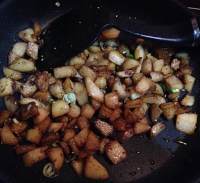 锅内放适量油烧8成热,放入葱花,辣椒粉、花椒粉,孜然粉快炒两下爆香,放入土豆,炒制,加生抽,再炒制一会,一定要再加少量水,炒至土豆完全熟软,放适量盐再出锅。