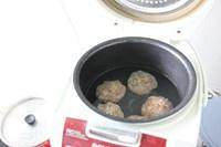 等全部肉馅都做成狮子头放入电饭煲中,按下煮饭按钮,火力加大,等到水沸腾后,再转为”保温“,这点很重要很重要,用短时间的大火将狮子头的表层凝结,整个狮子头就不容易散,再减小火力慢炖,锁住肉味。