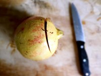 放下刀,左手托住石榴,右手用力抓着已经切开的石榴顶部拧一拧,然后抓起,就成功分离了一个盖子啦