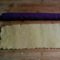 将紫薯泥搓成长条备用。将面团擀成长方形长度与紫薯泥一样。