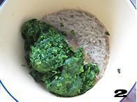 将洗净的菠菜切碎挤去多余水分,粉条切段放入搅拌盆