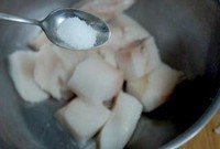 切好的鳕鱼块装入碗里,加入盐、料酒、胡椒粉腌制一会