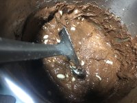 分3⃣️次倒入奶粉和巧克力粉,用锅铲混合搅拌均匀,注意⚠️,这里搅拌是用锅铲了