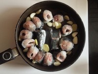 如图状 将鳗鱼像甘蔗一样竖着一块块放入锅内 这样可以防止鳗鱼皮粘锅底 将小碗水蒜姜倒入锅内 不家任何调料 为了防止蛋白质凝固 再加入料酒 开火烧