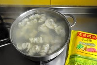 炉上同时放两只锅,一只煮湾仔码头江南鲜水饺。大火把水烧开,放入水饺,中火煮5分钟,期间不必加水,再开盖煮一分半即可捞出。