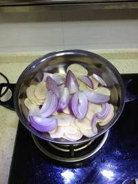 萝卜切厚片、洋葱切大瓣放入火锅盆中!