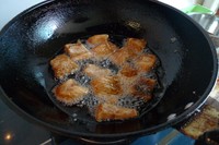 热锅放入油,油温2成热时放鱼。炸40秒翻另一面炸熟。把鱼捞起。
